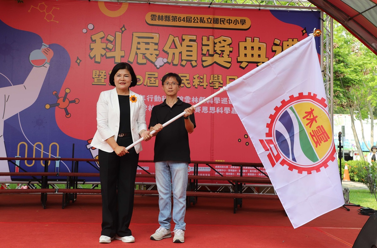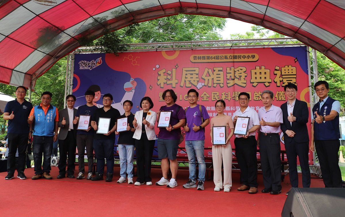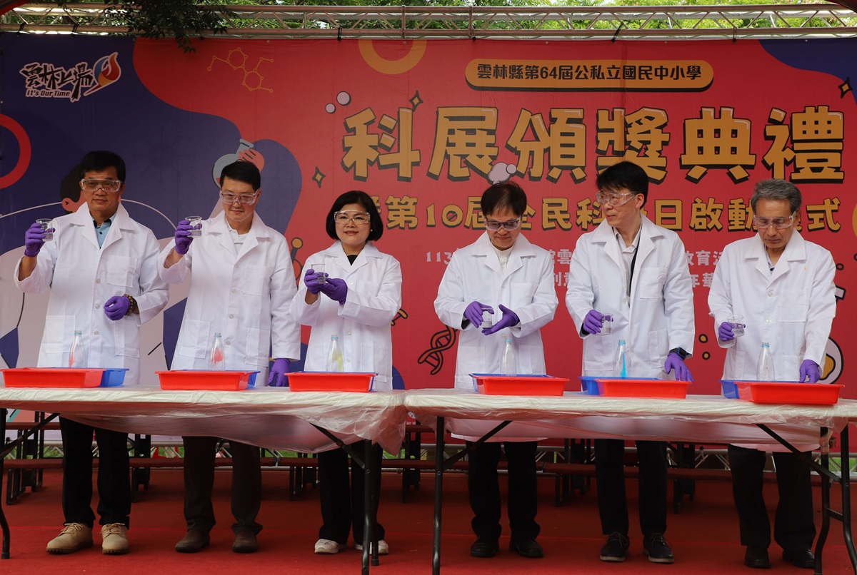 雲林縣第64屆科學展共有來自全縣各學校200多件作品參賽,經過初賽、複審、決賽後,國中組43件、國小組64件獲得佳作以上成績,其中包括斗六國中、成功國小等6所學校作品獲推薦參加全國賽,今天舉行頒獎及授旗,並同步為第10屆全國科學日舉辦啟動儀式,及第三屆雲林go科技創意賽恩思科學嘉年華活動。縣長張麗善出席頒獎與授旗,議員李明哲、賴明源及議員黃勝志秘書賴志恩、縣府教育處長邱孝文及全縣各學校校長、師生出席觀禮。