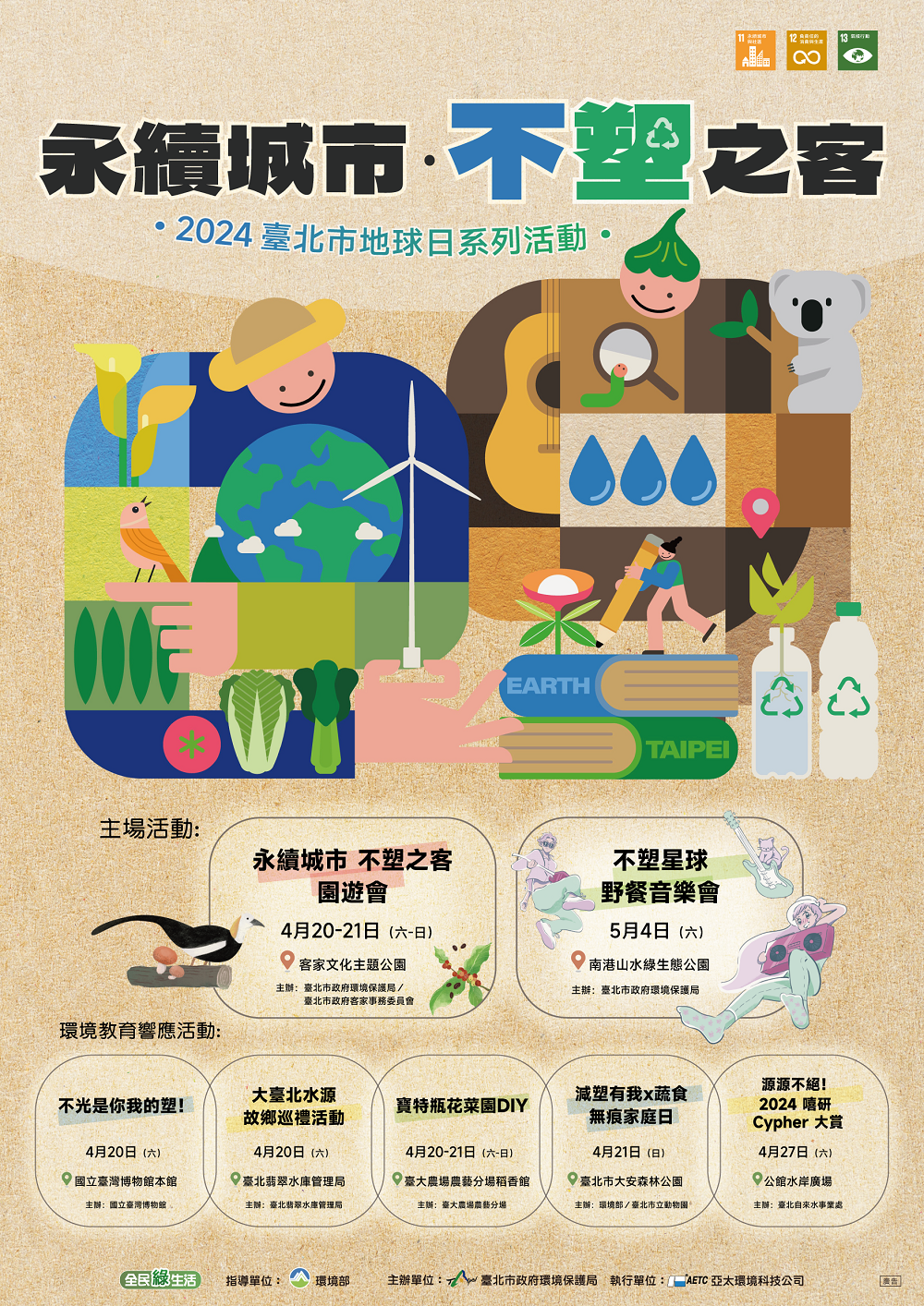 【記者賴麗娟台北報導】響應422地球日,臺北市環保局與北市客家事務委員會、台北市客家文化基金會跨局處、跨領域辦理「永續城市‧不塑之客」園遊會,將在4月20日至4月21日(星期六、日)於北市客家文化主題公園精彩登場。2024年地球日主題為「Planet vs. Plastics | 地球與塑膠」,為實踐「聯合國永續發展目標」(SDGs),達到「2050淨零排放」願景,現場除結合永續精神的吃喝玩樂攤位外,並安排劇團表演、繪本說故事等活動,期待透過園遊會提高市民對環境問題的意識和重視,並鼓勵大家採取行動保護地球,一同努力邁向「永續城市」,推廣「無塑生活」,成為愛地球的「不塑之客」。
