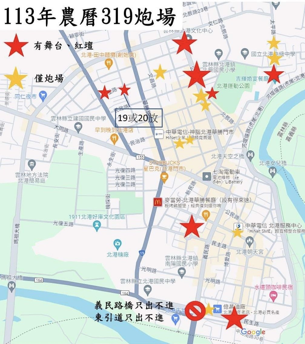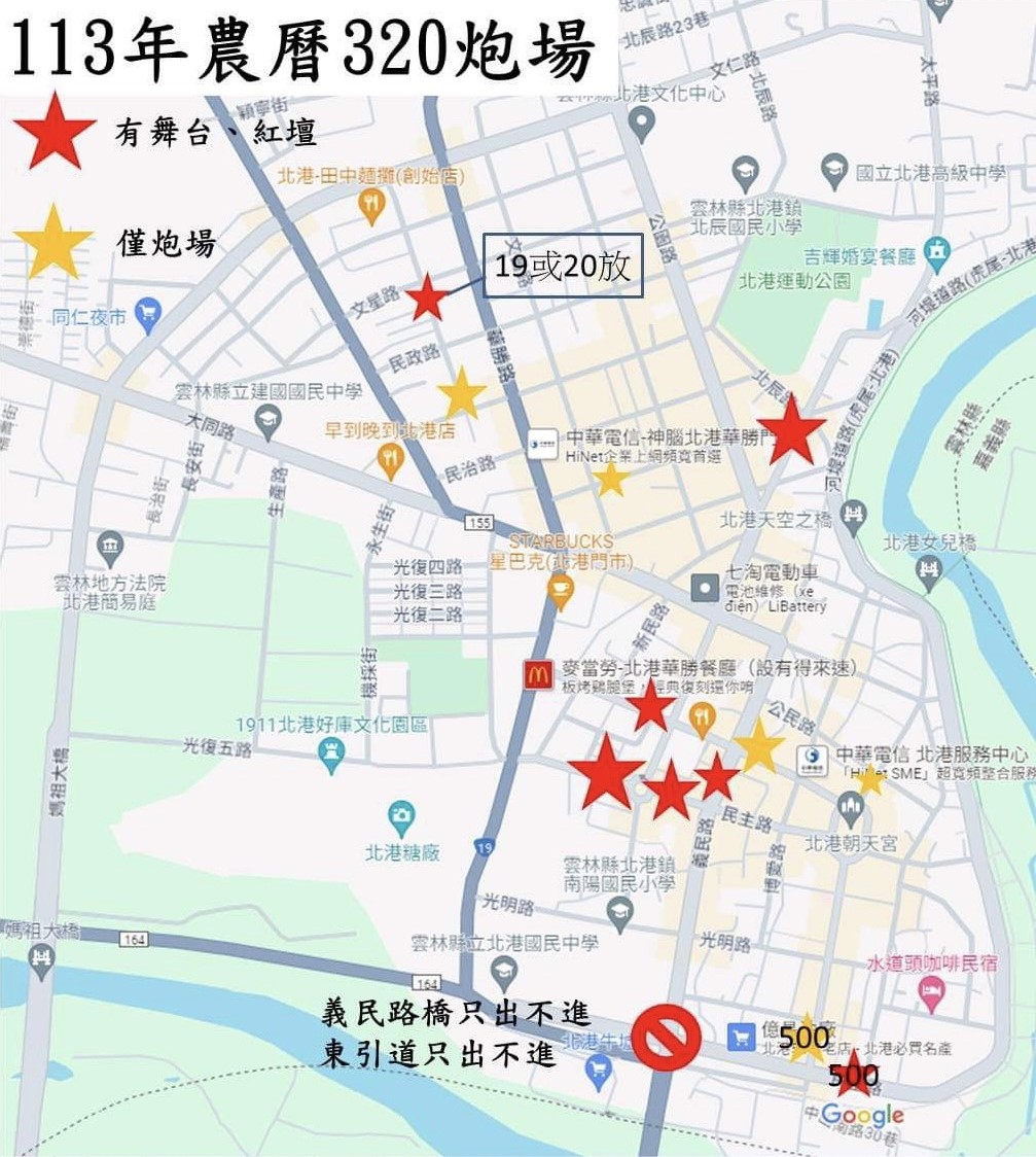 北港媽祖遶境北港警分局公布4月28日(農曆3月20日)28處炮場,義民路橋只出不進、東引道只出不進。