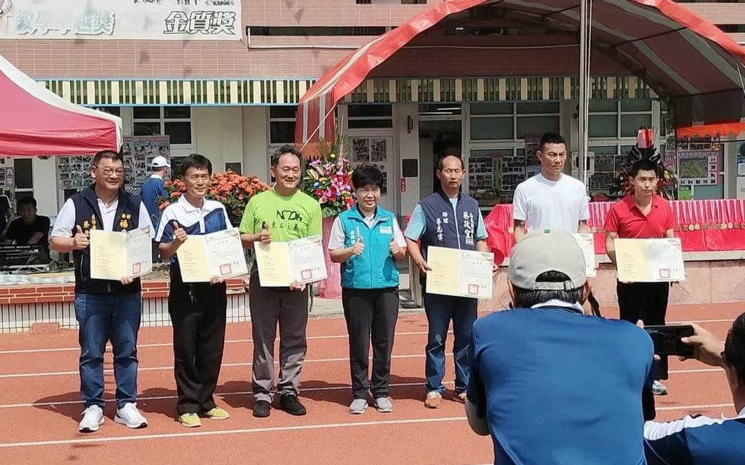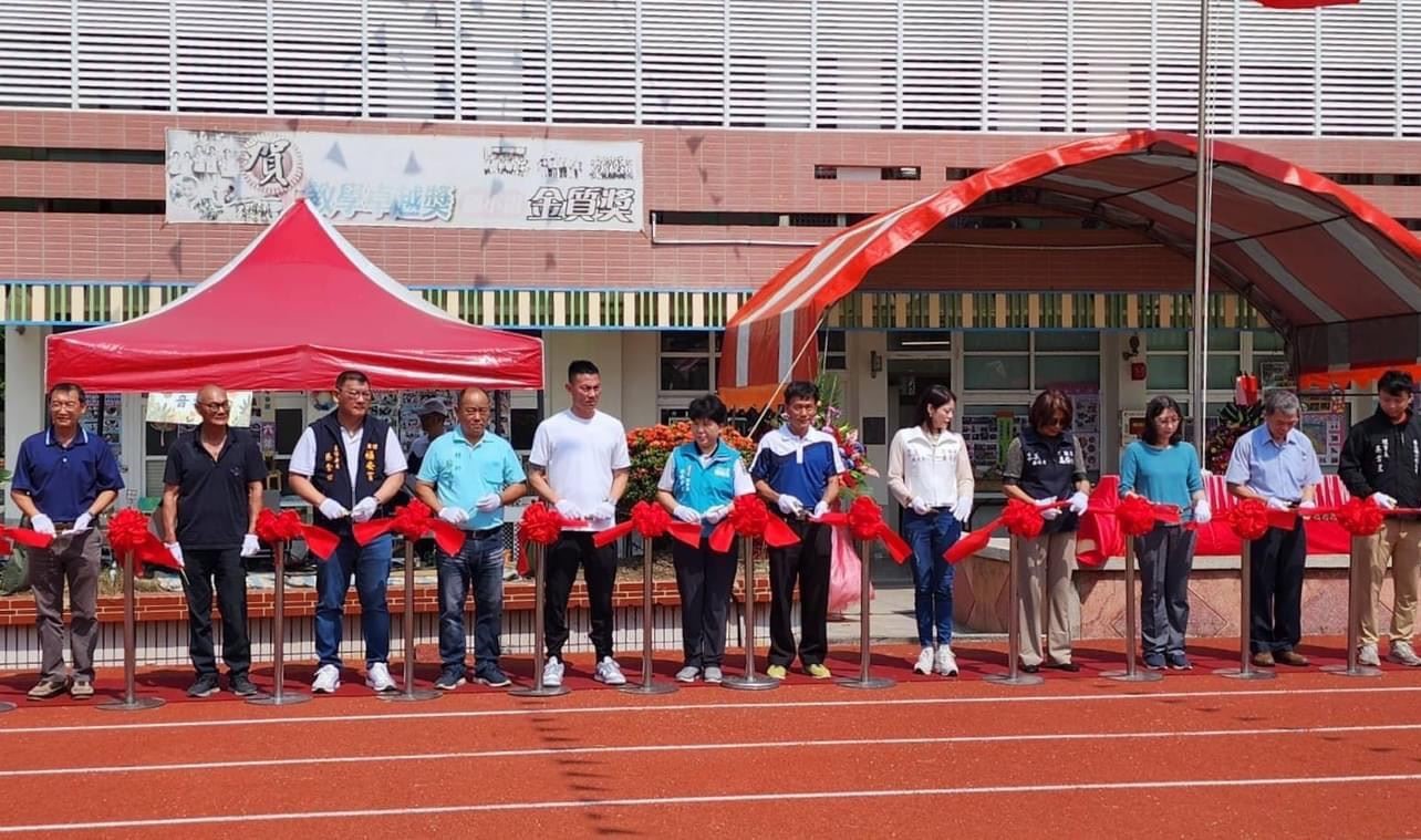 嘉義縣東石國小於20日舉辦108週年校慶暨PU跑道啟用典禮,教育處長李美華等嘉賓一同參與剪綵儀式。