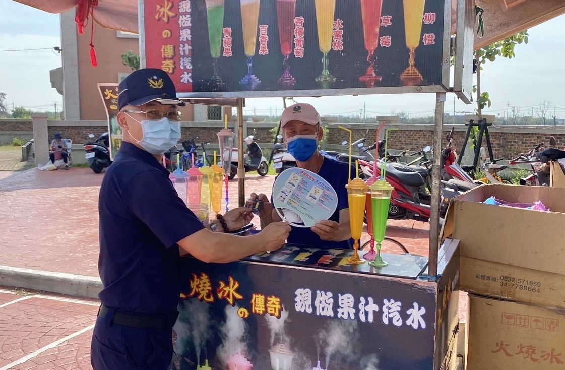 北港員警向現場設攤民眾進行反詐騙及交通安全宣導。