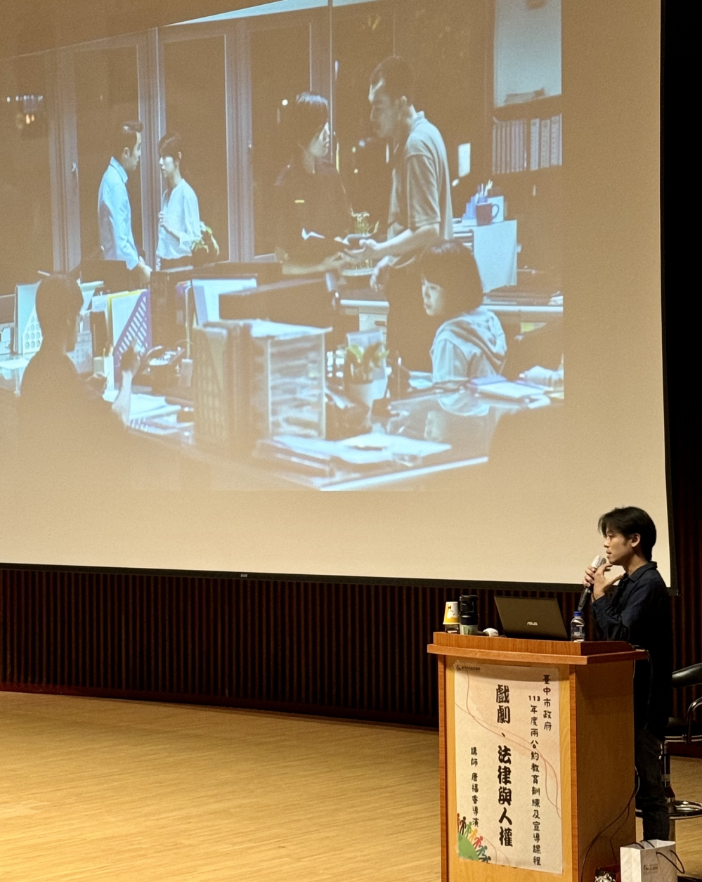【記者林獻元台中報導】《童話世界》、《八尺門的辯護人》原著作者兼導演唐福睿24日擔任台中市政府兩公約教育訓練及宣導課程講師,以「戲劇、法律與人權」為題,唐福睿從其作品《童話世界》及《八尺門的辯護人》出發,分享從小說到影視改編的心路歷程,並向市府同仁講述相關人權議題。
