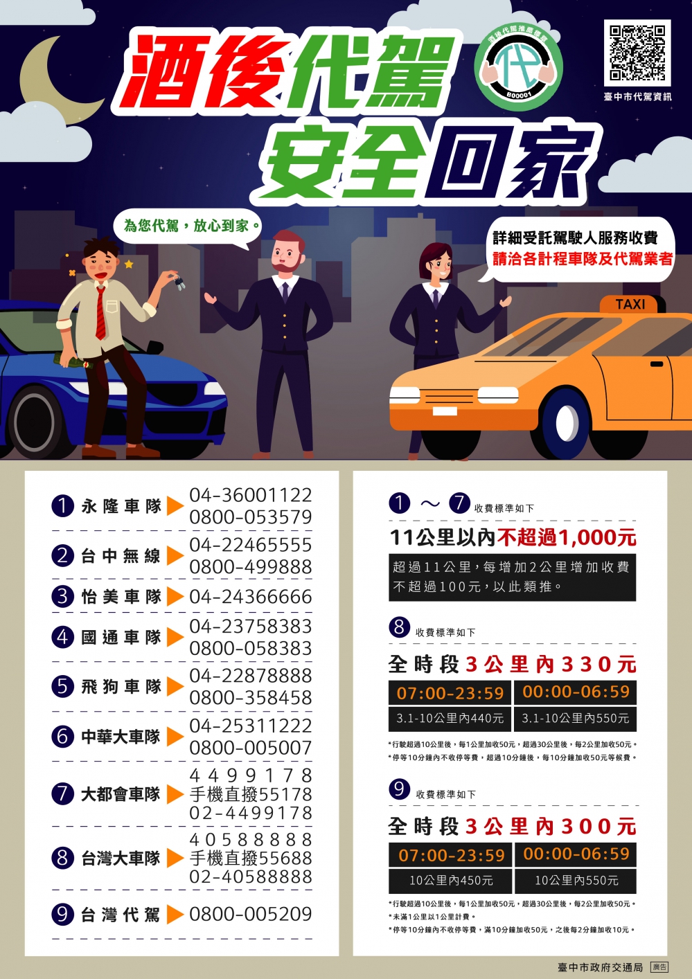 「拒絕酒駕從你我做起」,葉昭甫強調,交通局持續透過與台中市各轄區警察局深入飲酒場所宣導反酒駕,提醒民眾飲酒後勿開車上路;同時也鼓勵計程車的車隊業者,培訓更優秀的駕駛投入酒後代駕服務,透過系統平台優先媒合取得標章認證的駕駛增加接案的機會。市府相關單位亦運用不同管道,推動剛柔相濟的手段,杜絕酒駕行為,並協請經營飲酒場所業者勸導民眾酒後不開車,不要心存僥倖,由合法酒後代駕業者協助載送,共同對道路交通安全盡最大心力。