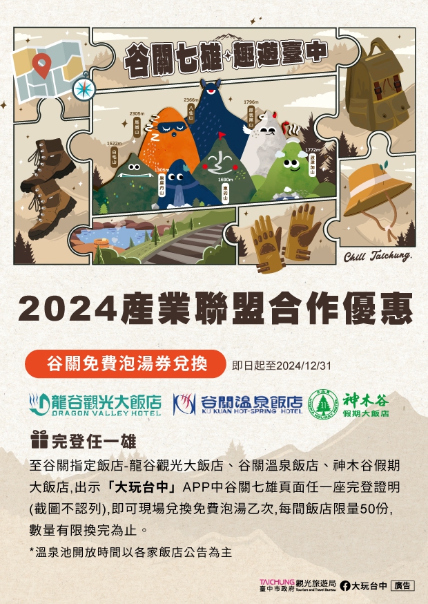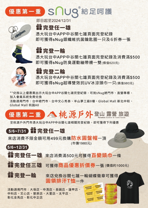 觀旅局補充,每年山友們期待的產業聯盟合作優惠,今年也持續進行,即日起民眾可憑大玩台中APP中的谷關七雄完登紀錄至合作店家兌換相關優惠產品。此次合作的店家有戶外用品專賣店-桃源戶外、機能襪專賣-sNug給足呵護、谷關知名溫泉飯店-谷關溫泉飯店、神木谷假期大飯店、龍谷觀光大飯店,各店家依不同的完登任務提供多項兌換優惠。