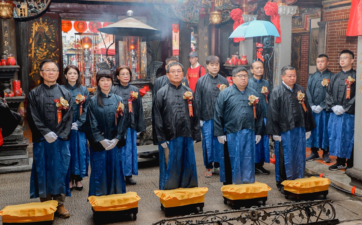 代理縣長劉培東、立法委員陳冠廷、新港鄉長葉孟龍等人身穿長袍馬褂出席新港奉天宮祝壽典禮。
