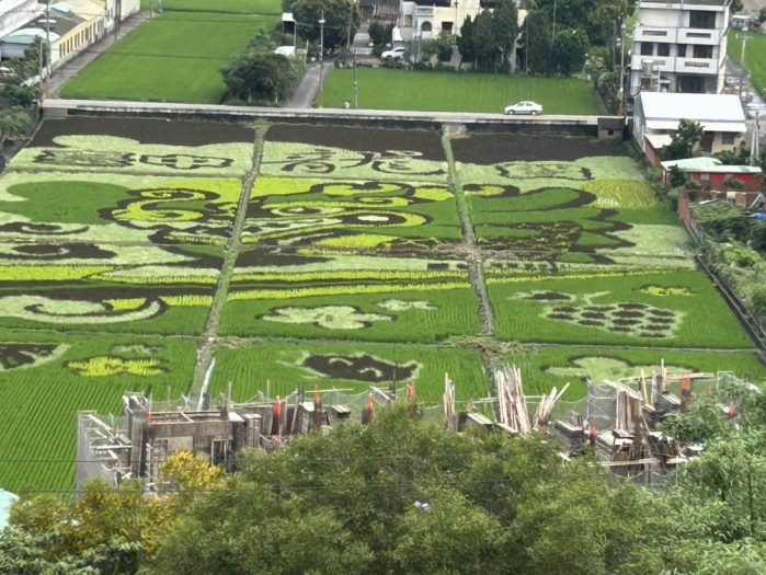 外埔農會以近百萬元經費,配合苗栗農改場,由苑裡農會專家,在外埔區水流東旁,觀景台下一點三公頃的農地上,執行打造稻田彩繪,精細採用四種稻穀原色黑、黃、綠及深綠等四種顏色,由外埔國中學生插秧,織成台中龍賀圖騰,從上一望,特別雄壯亮麗。