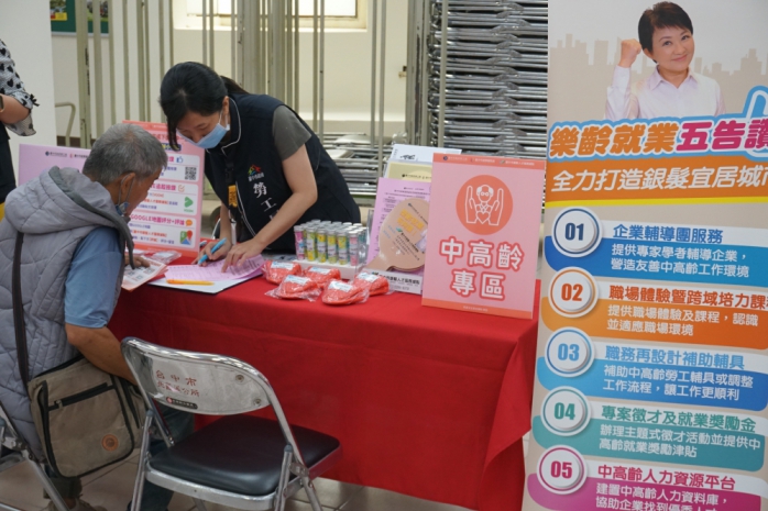 勞工局長林淑媛表示,市長盧秀燕關心中高齡及高齡者就業,推動「樂齡就業五告讚方案」,除提供職場體驗跨域培力、就業獎勵、職務再設計、企業輔導及中高齡人力資源平台等多項優質服務外,並搭配勞動部「55Plus壯世代就業促進獎勵」,只要年滿55歲以上或年滿45歲以上依法退休者並離開職場3個月以上,經公立就業服務機構推介就業,勞工最高可領取6萬元獎勵金、補助企業職場支持輔導費每年最高30萬元。
