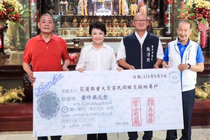 【記者林獻元台中報導】台中市清水紫雲巖3日舉行捐贈儀式,由主委吳勝隆率領全體幹部,在市長盧秀燕、台中市議會議長張清照、前議長張清堂及民政局長吳世瑋見證下,宣布捐助花蓮災區善款1千萬元。市長盧秀燕表示,921大地震發生後,台中受到各界幫助,現在須將心比心協助花蓮,感謝紫雲巖及台中市宗教團體及相關單位的捐獻,她近日將代表台中帶著各界愛心前往花蓮送暖,盼花蓮早日完成重建、走出震災傷痛。