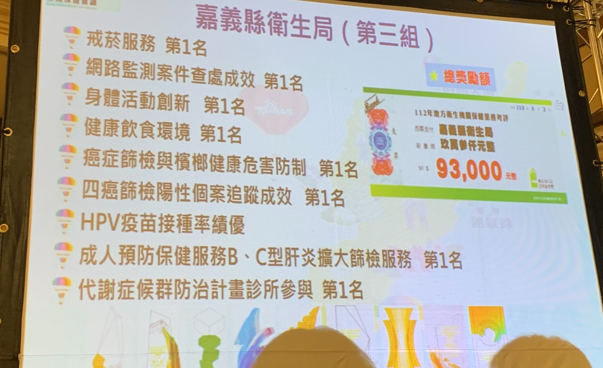 【記者蘇榮泉嘉義報導】全國保健大會2、3日在台東舉行,嘉義縣衛生局112年績效卓著,由國健署長吳昭軍頒獎,嘉義縣囊括癌症篩檢、菸害防制、健康飲食、成人預防保健等多項大獎;民雄、大埔、阿里山3家衛生所參加「第15屆金所獎」也分別獲頒優等獎及2項佳作獎,嘉義縣衛生局更榮獲「督導有方獎」及「特別獎」之殊榮,總共搬回18大獎項,9項業務表現第一,在本次全國競賽大放異彩。