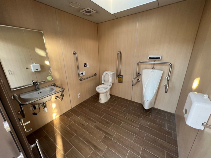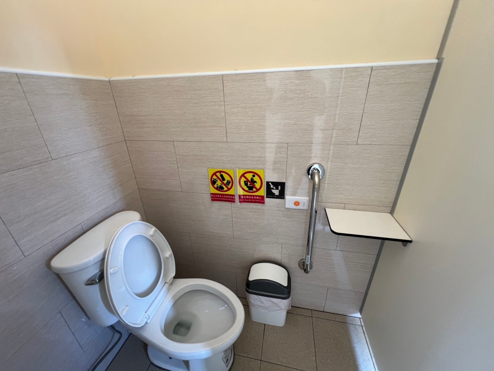 平時都會到軍功公園散步的王姓夫妻檔說,以前設備比較老舊且環境較髒亂,改善後的廁所看起來很乾淨、很明亮,且有設置物架,使用起來很方便,新增的親子廁所對於孩童來說更有安全感,親子廁所還提供給嬰兒換尿布的架子,讓孩童及家長都可以安心上廁所。