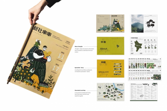 嶺東科大指出,「新社串串」是視傳系學生許銘娥、葉駿霖、 楊語庭、鍾佳諭、吳芳萱及陳若瑄的專題成果,結合19個產業23位職人,將新社中和品牌化,統一新社中和視覺感受,透過各種水果製作成果醬、沖泡粉等,集結成禮盒包裝,以拼圖為發想,呈現出一幅「當地特色景觀畫作」製作「禮拼」包裝,小農職人將產品伴手禮的方式,讓遊客帶回家與親友分享,增加遊客與在地人的遊玩體驗。創作學生們表示,很開心能參與USR計畫而有機會深度體驗走訪新社,深入了解在地文化與故事,讓我們深刻體會到社會設計的意義。