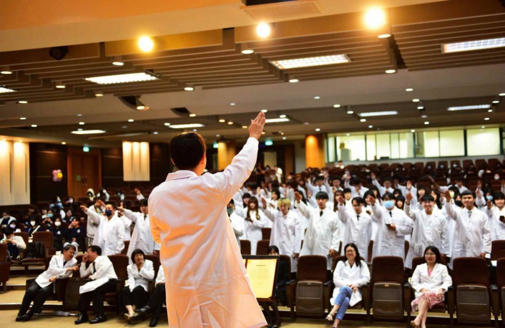 授袍典禮中,實習分發成績第一名的林文信同學帶領全體同學們宣示未來的志向,承諾將奉獻所學、追求新知、堅守對病人健康權益的守護,並以醫學檢驗為職志與榮耀。台中慈濟醫院王俊民主任期勉學子們將實習視為職場的前哨站及挑戰,並提醒他們在實習中不僅驗證理論與實務的結合,更體驗到科技日新月異帶來的實驗室自動化與檢驗技術創新,期望他們能自我充實、不斷成長。