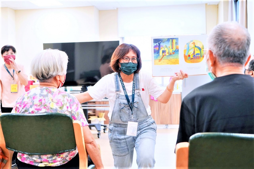 中彰投分署指出,暱稱「丫惠」的黃美惠老師就是受惠於這個計畫所培育出來的講師。留著俏麗短髮讓人看不出已經55歲的她,穿著俏皮的吊帶褲、卡通襪子,穿梭在長輩間活靈活現地用台語講述繪本故事。
