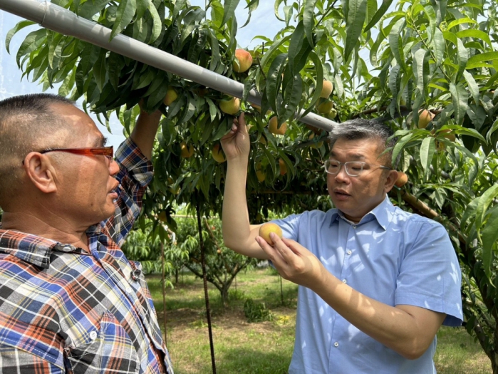 【記者陳榮昌外埔報導】台中市外埔區種植水蜜桃漸實力,注重農業的立法委員蔡其昌八日參訪農友徐寶卿,十分肯定徐農友善的種植生產,對消費者的品嚐具有安全性,且水蜜桃多汁、高甜度、果肉軟硬適中具至高品質。蔡立委表示,徐農友良心種出這種高檔水蜜桃,將可為消費者帶來食慾享受,產期祗到端午節前後,他除要協助推銷外,籲民眾訂購要快,否則要再等一年才再可吃到。