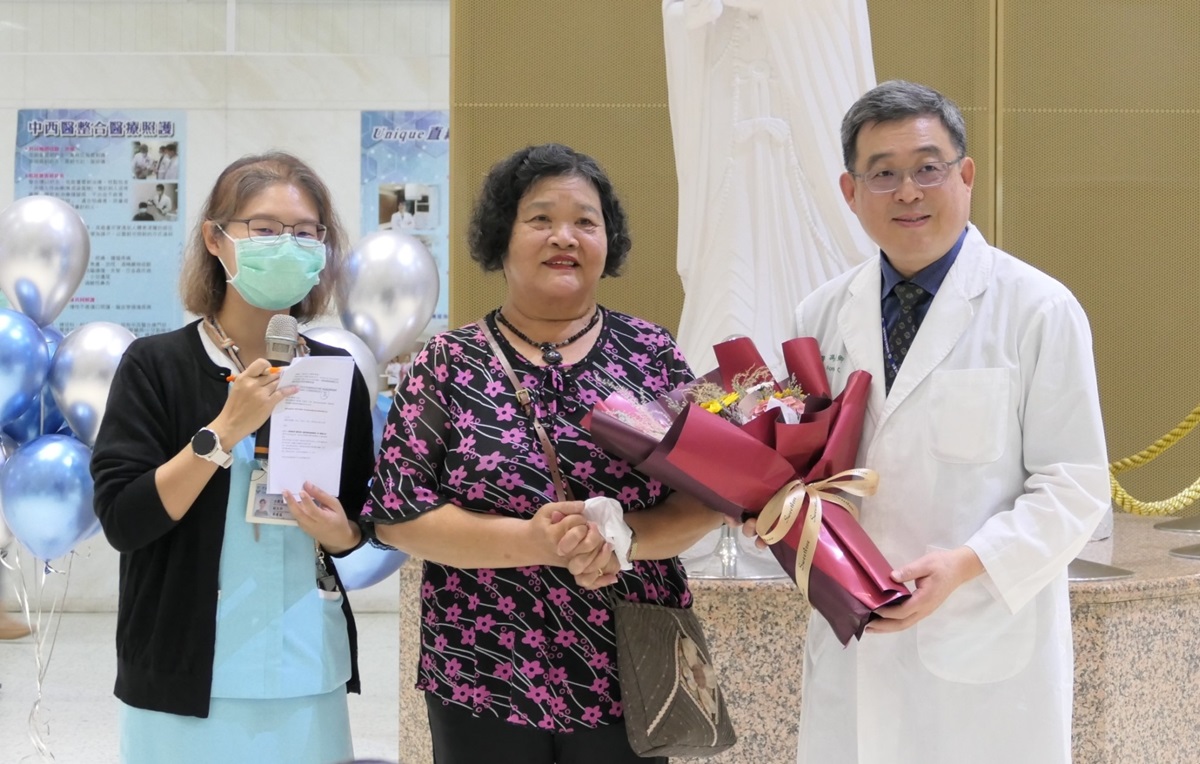 病友邱女士溫馨獻花感謝馮逸卿醫師。