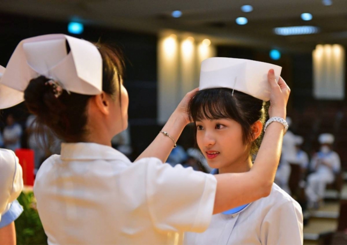在加冠典禮上,中臺科大校長陳錦杏致詞時表示,護理系作為學校創校基石發揮著重要的作用,特別在新冠肺炎疫情肆虐的時期,許多年輕學子堅定地選擇成為護理師,以守護社會大眾的健康,這種無私的奉獻精神令人感動。