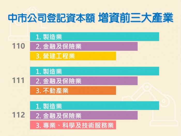觀察近三年公司登記增資概況,110年至112年間增資最多的前二名分別為製造業、金融及保險業,第三名則屢有更迭,110年為營建工程業、111年為不動產業,112年專業科學及技術服務業異軍突起。