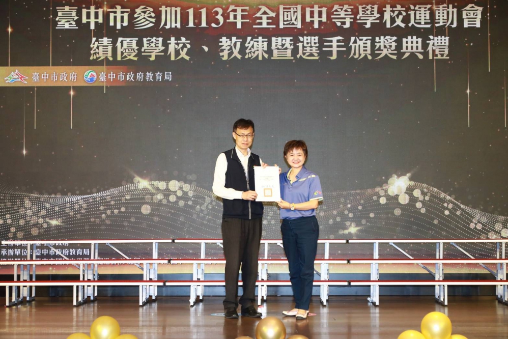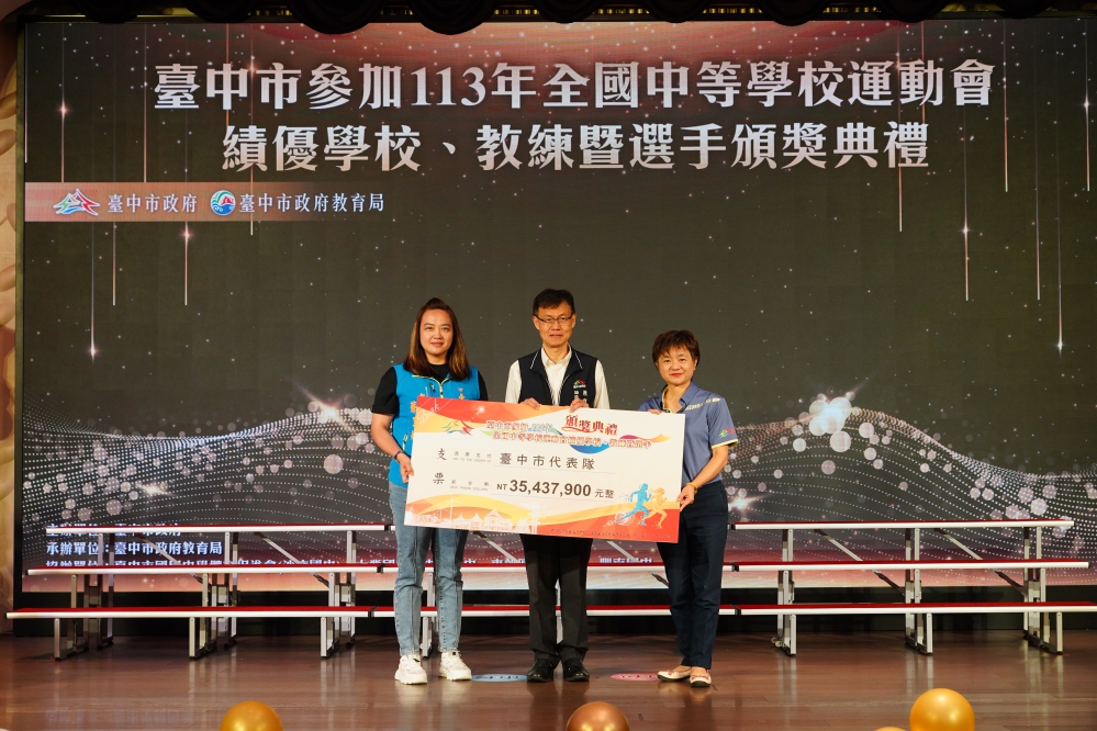 教育局長蔣偉民代表市長盧秀燕表揚頒獎給優秀的選手及教練,共頒發體育獎金超過3500萬元,針對優秀學校,每面金牌加發組隊學校獎金10萬元,如獲競賽種類各組別總錦標前三名者,發給績優獎金5至15萬元不等,藉以協助、延續培訓工作,以提升台中競技運動實力及成績。