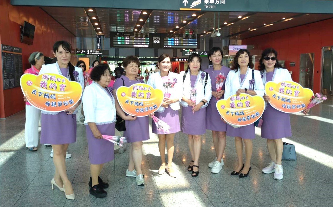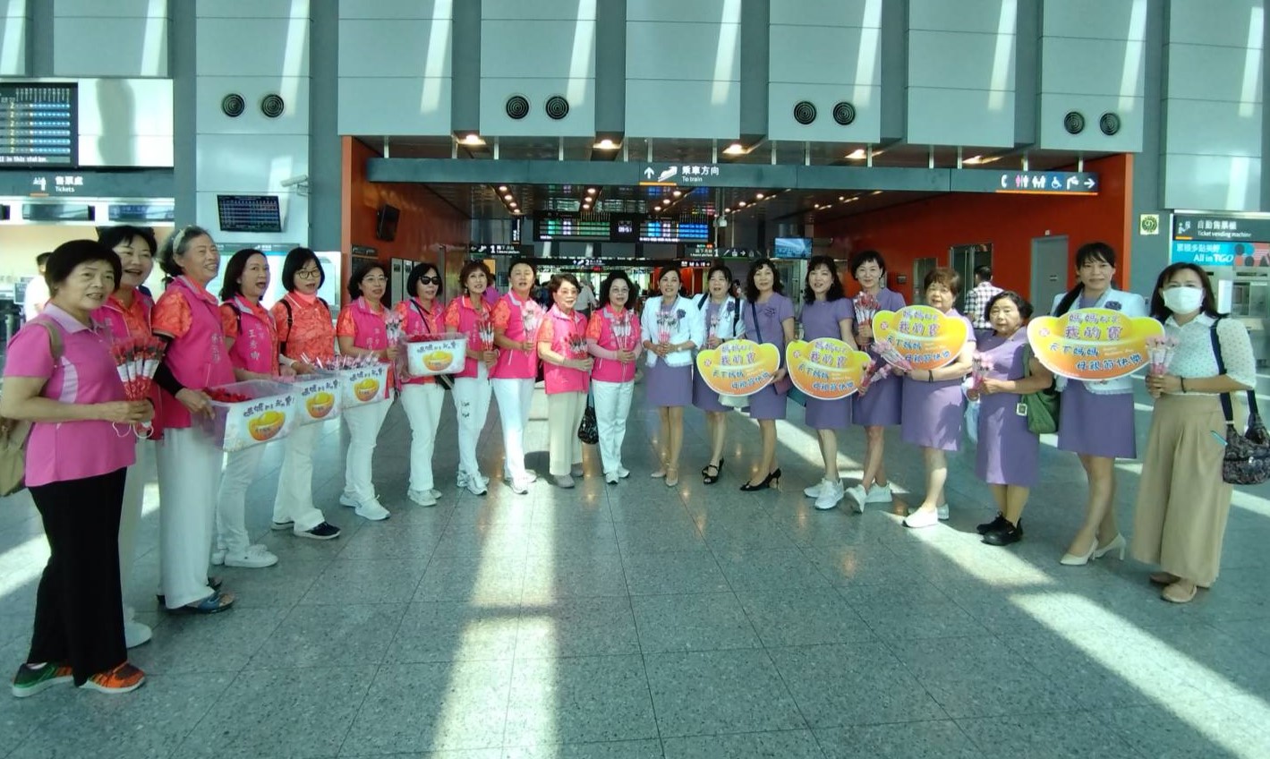 雲林縣婦女會黃麗花理事長暨婦女幹部等人在高鐵雲林站前,一同致送康乃馨,提前向返鄉的旅客祝賀母親節。