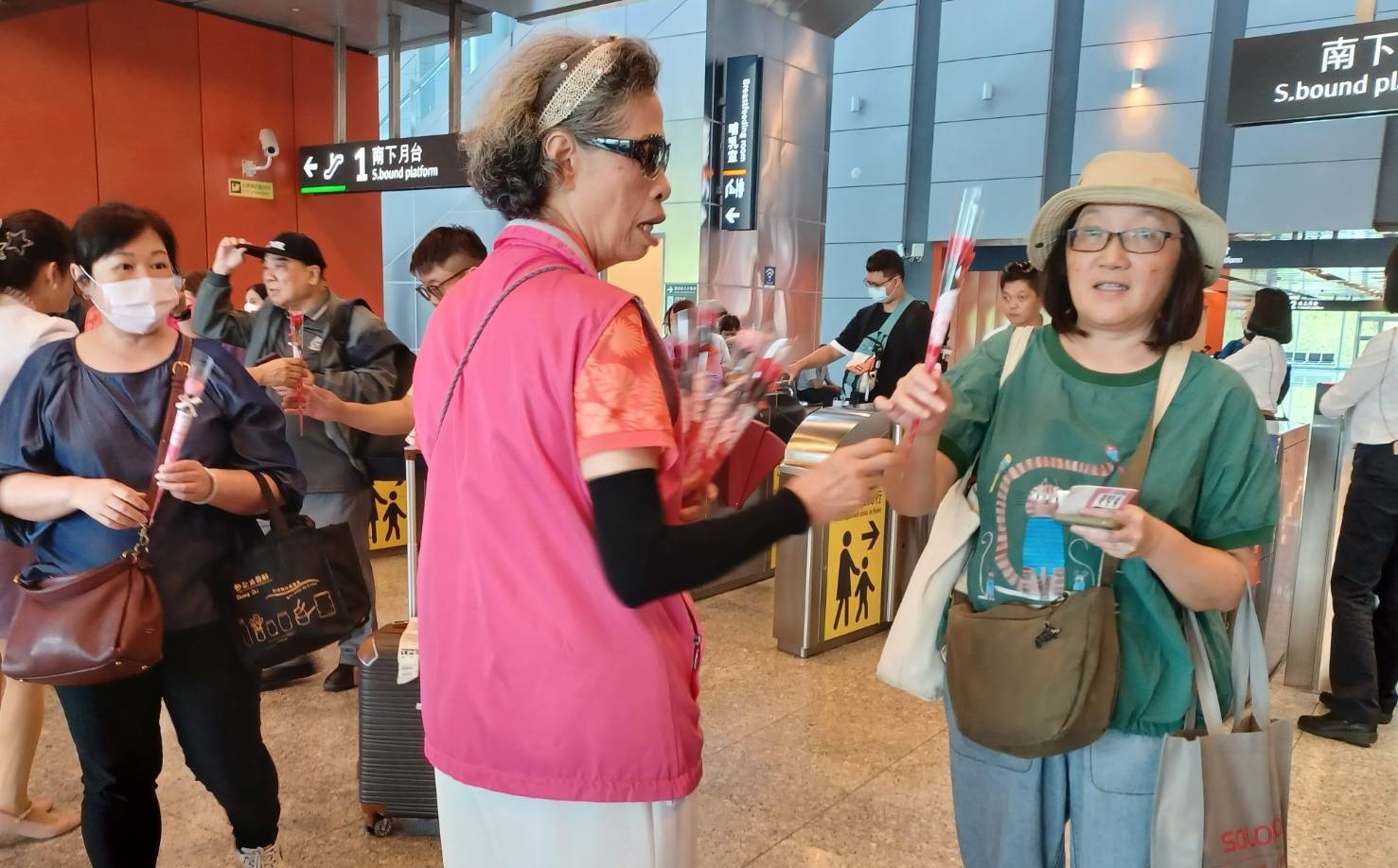 在高鐵雲林站前一群雲林縣婦女會人員向旅客致送康乃馨,提前向返鄉的旅客祝賀母親節。