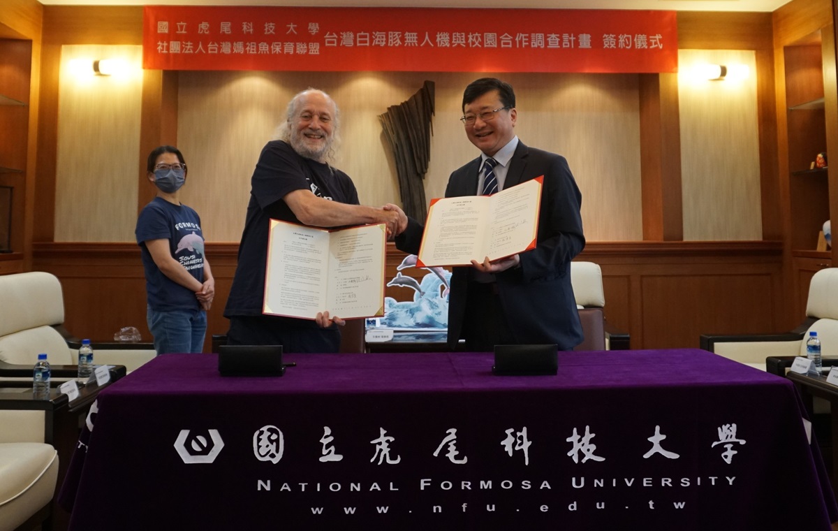 虎科大校長張信良(右)與媽祖魚保育聯盟理事長文魯彬代表簽署「台灣白海豚無人機與校園合作調查計畫」,共同維護海洋生態。(圖/虎尾科技大學提供)虎科大飛機工程系系主任宋朝宗指出,利用遙控無人機進行白海豚調查具有許多優勢,包括節省船隻費用、解決船隻無法進入淺水域的問題,以及避免船隻對鯨豚造成的騷擾。此外,無人機還能夠在一定距離內跟隨,突破了船隻和陸地觀測的限制。