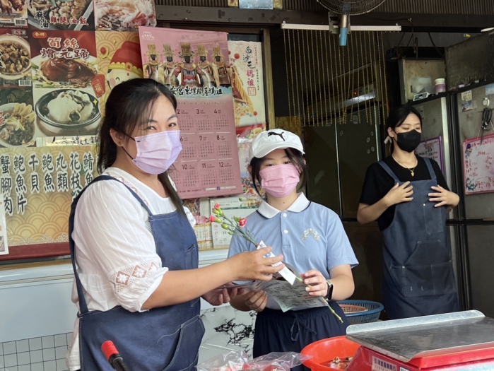永靖區兒童班的小菩薩浴佛結束也到鄰近市場敦親睦鄰無法前來參加的攤販一一送上一朵代表母親節的花康乃馨祝福天下媽媽母親節快樂。