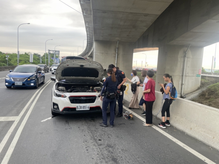 分局指出,林厝派出所警員蕭瑞錡、吳依潔,本月4日下午5點10分,執行巡邏任務途經76號東西向快速路林厝交流道時,發現1輛自小客車熄火而停在車道上,後座乘客紛紛下車,員警發現險象環生,乃上前查詢,並協助警戒後方來車小心駕駛,以確保人車安全。