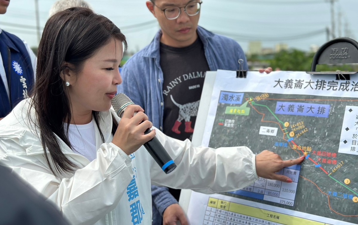 二崙鄉大義四號橋跨越大義崙大排因樑底高度不足,每逢豪大雨,山洪迅速流入,加上部分渠道斷面束縮,排水斷面不足,導致漫淹路面。張嘉郡表示,為提早發揮防洪功能,呼籲經濟部盡速核定補助大義四號橋改建。