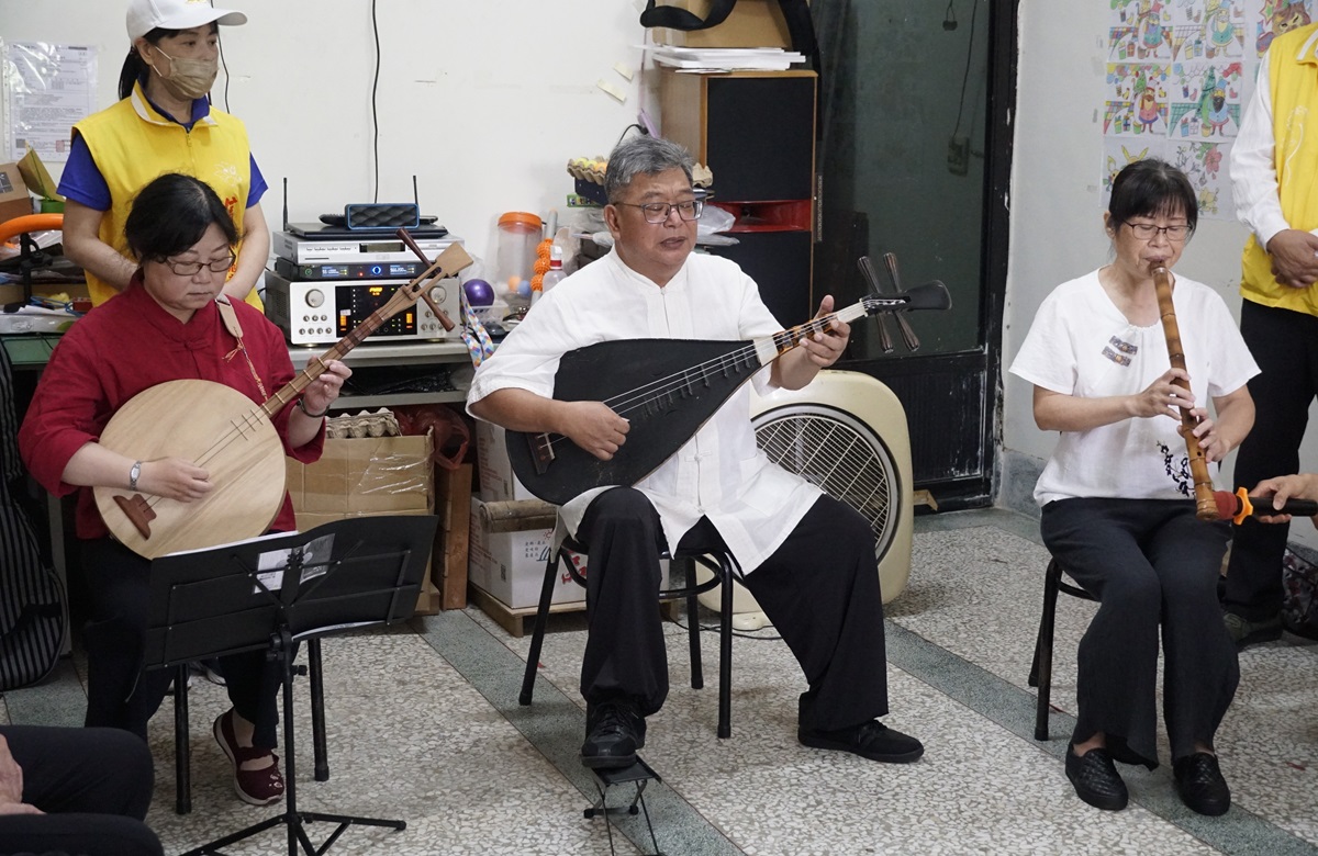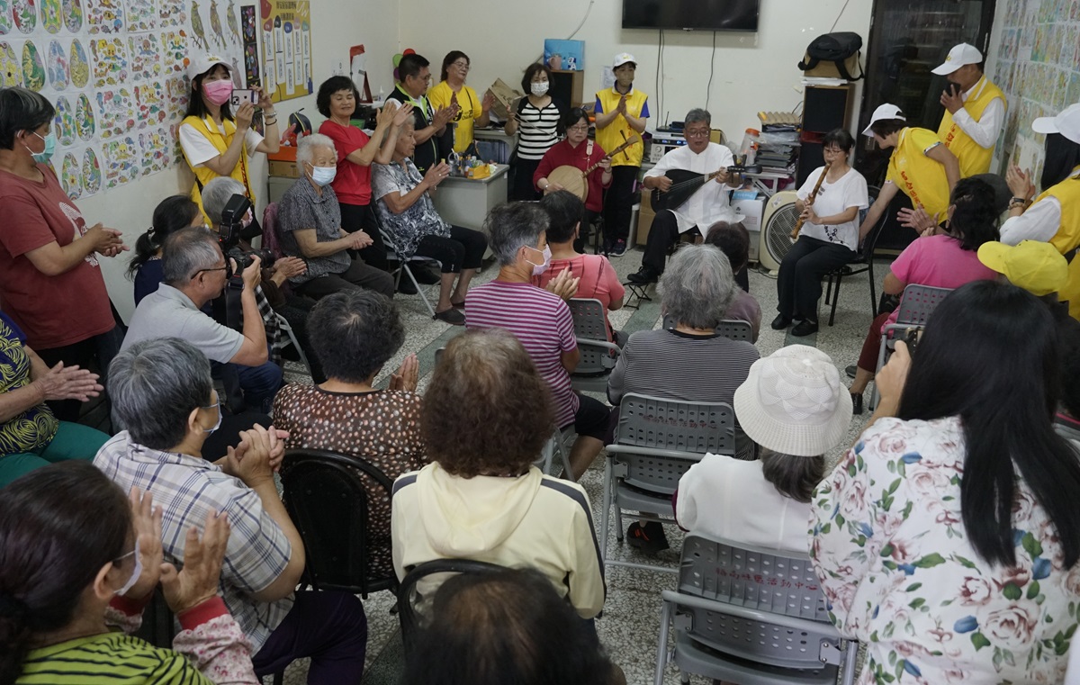 由許澤猛老師率翎的南管三人組蘇美汝、王美珍與長者一同歡樂。