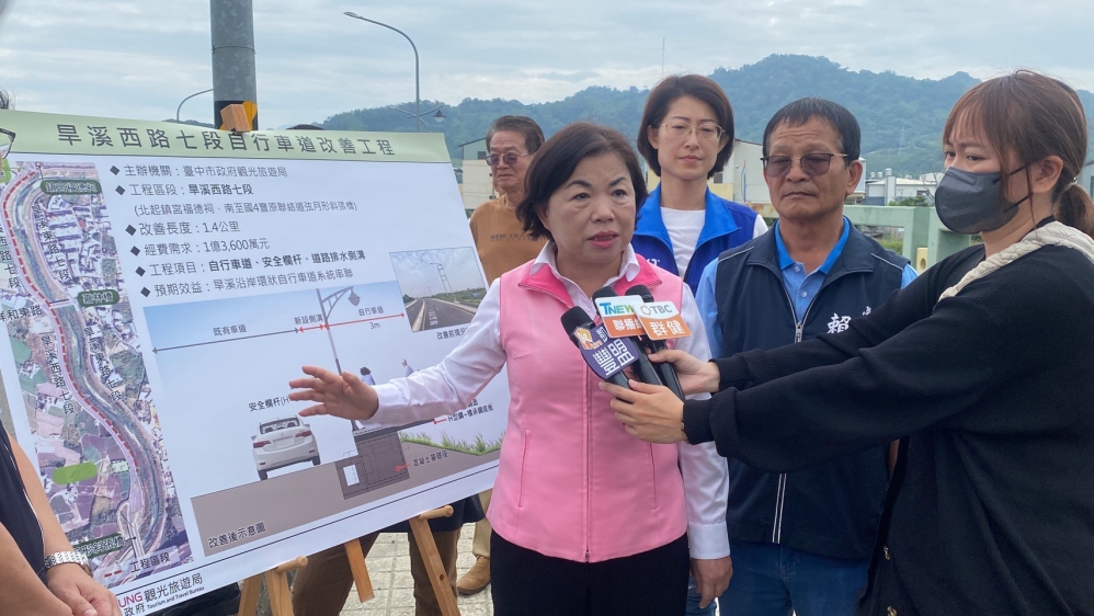 楊瓊瓔表示,旱溪西路七段自行車道,因國4豐潭段聯絡道工程而中斷1.4公里,觀旅局提出1.36億元恢復改善工程,以生態工法,不破壞河川原則施工,並遷移沿途路燈基座,提供3米寬車道供行人及自行車使用。