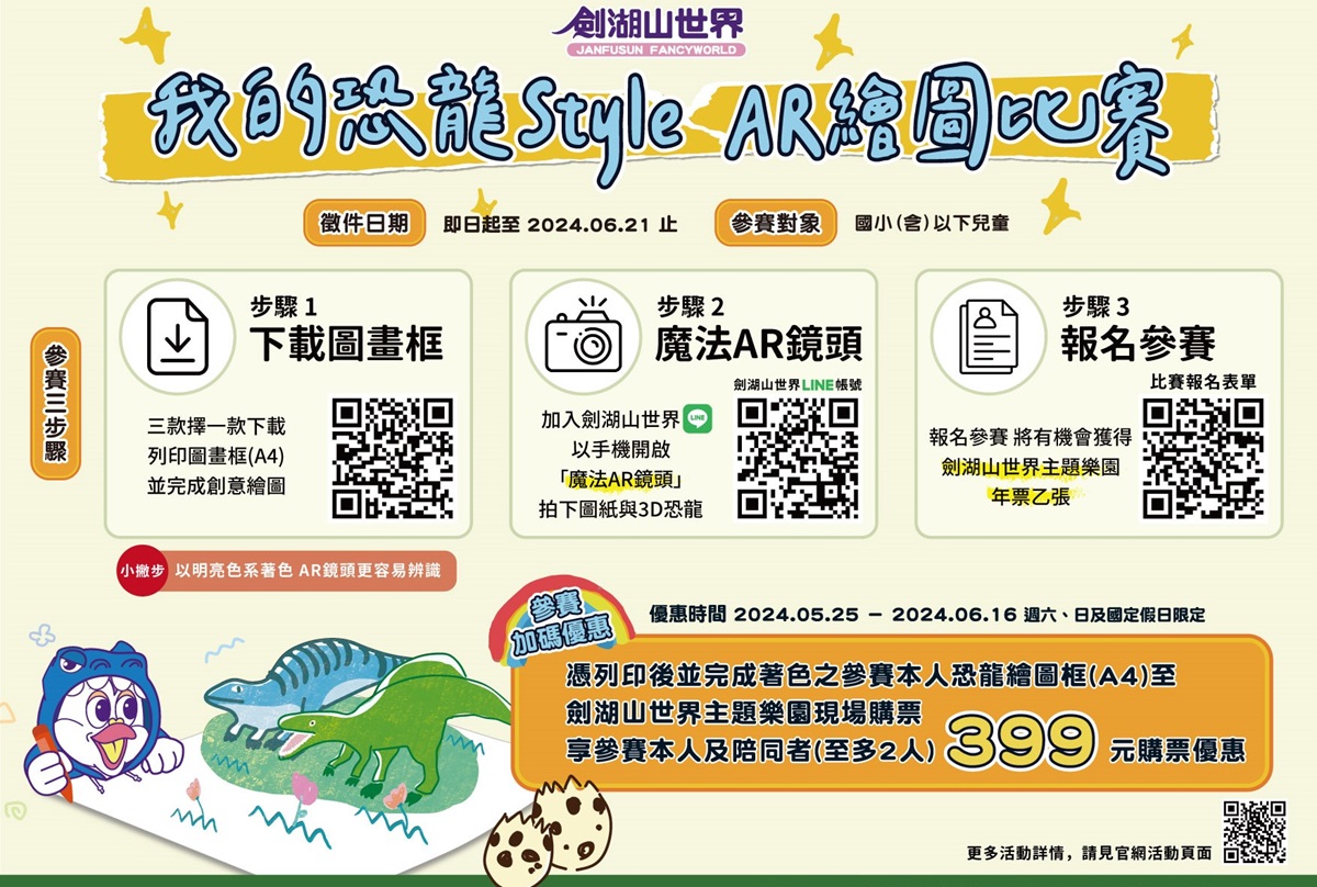 此外,「恐龍復活節」主題活動持續進行中,全新推出「我的恐龍Style AR繪圖比賽」,即日起至6月21日前,未滿12歲的小朋友們,進行參賽三步驟,1.至劍湖山世界官網下載圖畫框(三選一),2.加入劍湖山世界LINE官方帳號,以手機開啟「魔法AR鏡頭」拍下圖紙與3D恐龍,3.登入Google帳號填寫參賽報名表,完成基本資料及上傳參賽照片,送出資料即可完成報名,將有機會獲得劍湖山世界年票乙張。