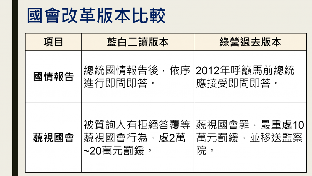 陳成添指出,過往民進黨提出的國會改革版本,都比現在藍白二讀的版本嚴格:(1)總統國情報告,民進黨2012年曾要求馬前總統接受立委即問即答。(2)藐視國會罪,民進黨曾提出最重處10萬元罰緩,並移送監察院,藍白僅處2萬~20萬元罰鍰。