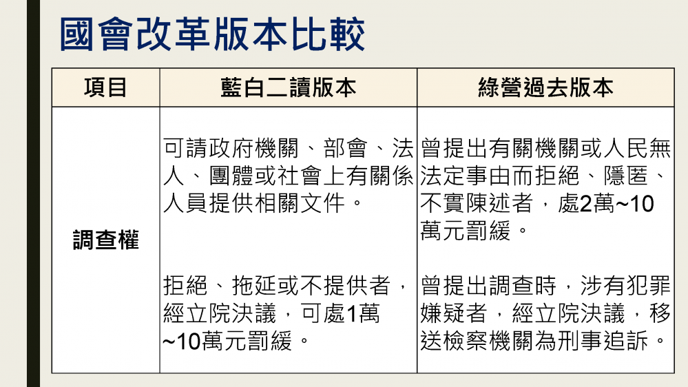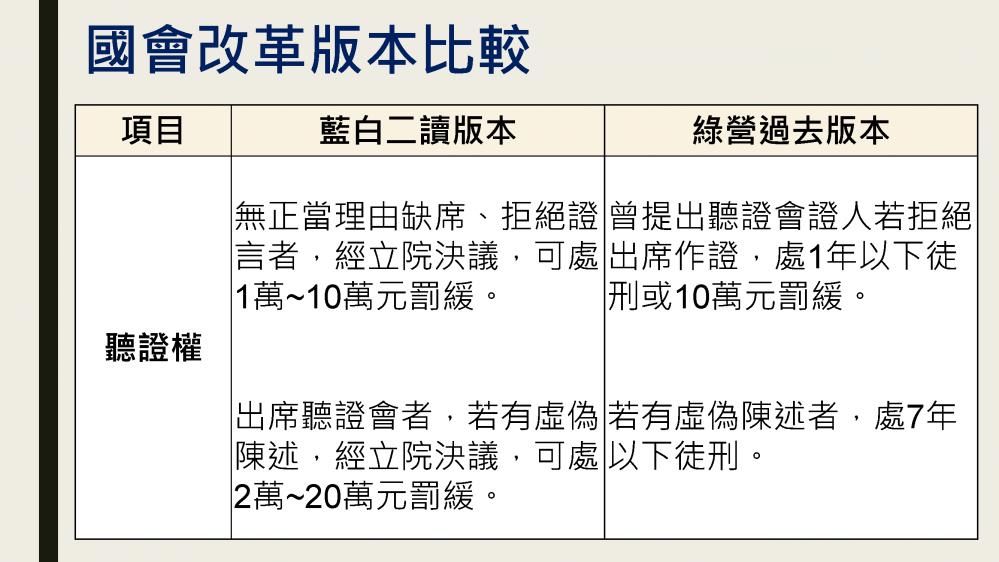 (3)國會調查權,民進黨曾提出拒絕、不實陳述者,處2萬~10萬元罰緩,且有犯罪嫌疑者可移送檢察機關,藍白版本則是處1萬~10萬元罰緩。(4)聽證權,民進黨曾提出若有虛偽陳述者,處7年以下徒刑,而藍白則是處2萬~20萬元罰緩。