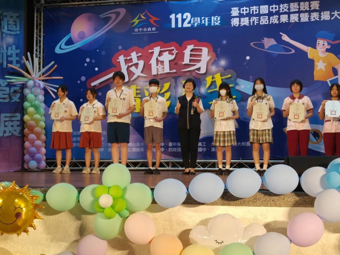 【記者林獻元台中報導】「台中市國中技藝競賽得獎作品成果展暨表揚大會」30日在台中高工集賢堂隆重舉行,「高中職教育暨國中適性輔導教育博覽會」也同時在該校體育館登場。台中市政府教育局副局長王淑懿到場頒獎給266位職群冠軍選手和181位技藝優秀的特教生,鼓勵學生在技職領域中找到自己的興趣和志向,為自己的職涯發展奠定最佳基礎。