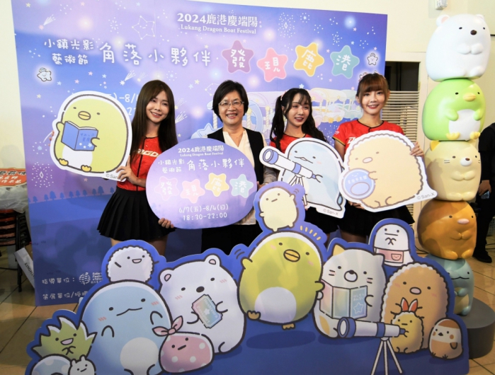 王縣長表示,「鹿港小鎮光影藝術節」,今年首度與日本療癒系IP「角落小夥伴」合作,在鹿港溪、公會堂、桂花巷藝術村、老街、中山路等街道布燈,有大型「角落小夥伴」可愛公仔,陪大家過一個羅曼蒂克夜晚。