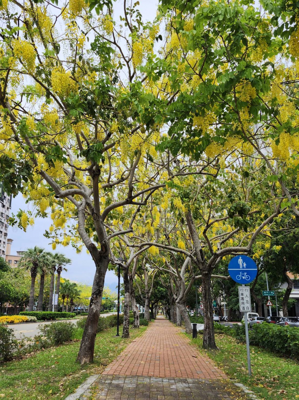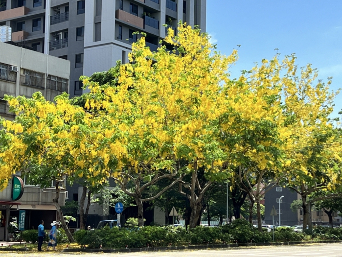 建設局說明,初夏最浪漫且吸睛的,就是阿勃勒的開花季,除南區興大綠園道、太平區坪林森林公園外,台中市區如旱溪東西路、龍德路一段、梅川園道、環中路四段、台中市政府前廣場、半平厝公園、黎新公園等多處人行道及公園綠地,皆可發現阿勃勒的蹤影,當金黃色的花瓣隨風飄落,或是鋪滿大地時,正是拍照的最佳時機,邀請市民朋友把握花期,帶著親愛的家人一起到公園內阿勃勒樹下野餐,享受最耀眼的「金黃色嘉年華」。