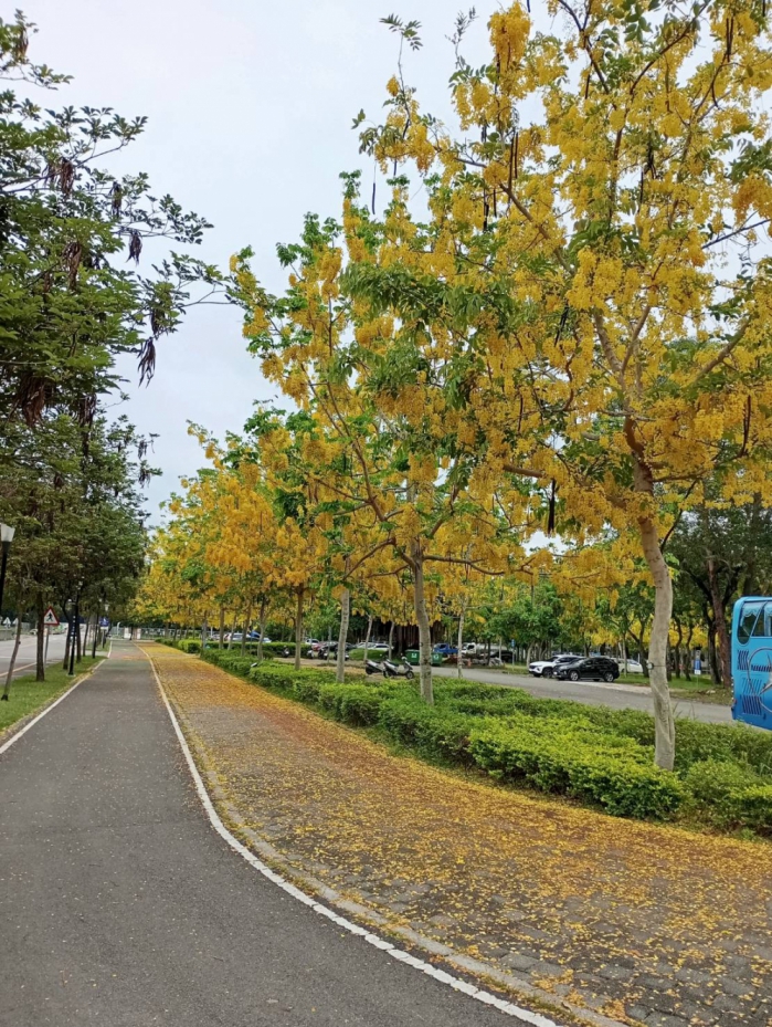 建設局長陳大田表示,每年初夏時,全樹開滿金黃色的花串,花瓣隨風搖曳如雨般飄落,因此又被稱為「黃金雨」。東區的興大綠園道種植逾百株的阿勃勒,目前正值阿勃勒盛開季節,綿延數百公尺,宛如置身於金色夢境的「黃金隧道」,成為市民和遊客拍照的絕佳場所。這條壯觀又充滿詩意的步道,吸引大量的市民、學生及遊客駐足觀賞,捕捉這美麗瞬間。
