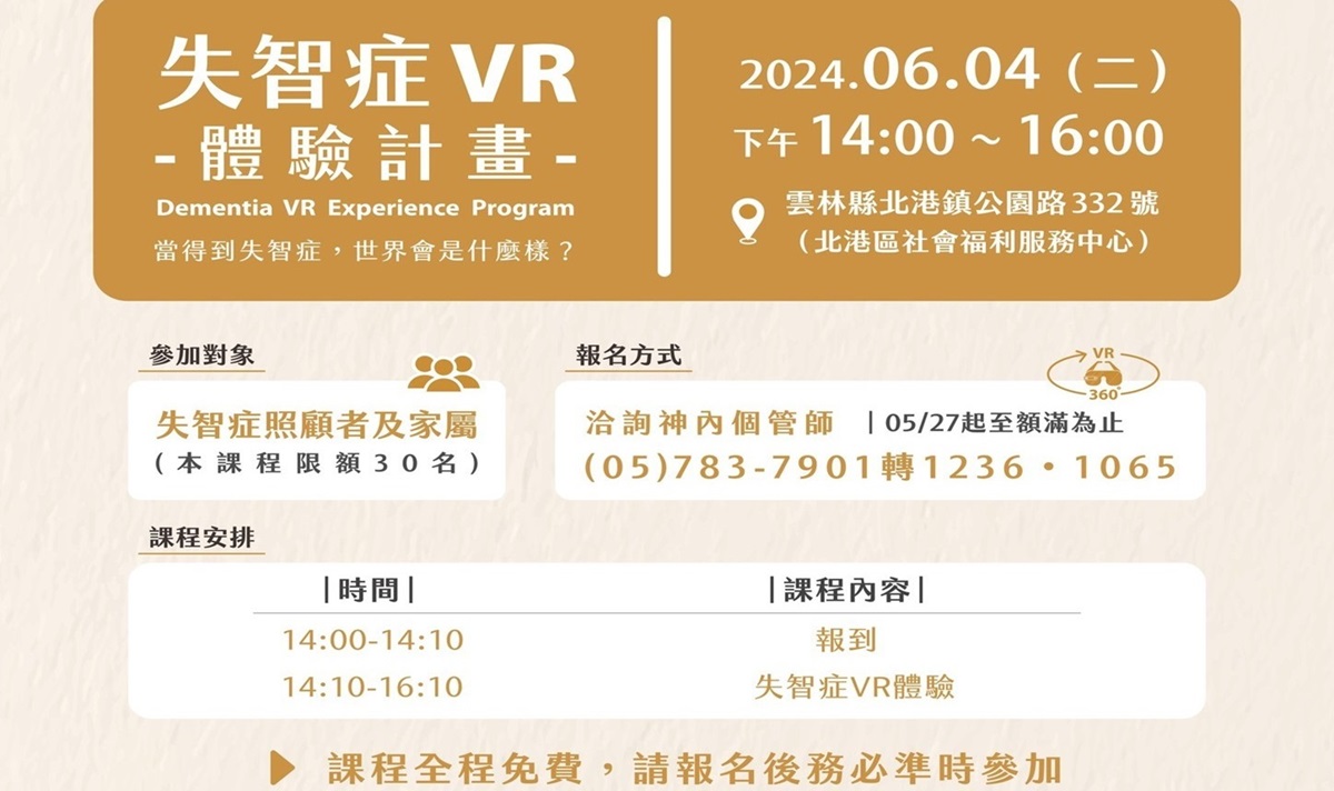 【記者蘇峰毅雲林報導】為應對快速邁入超高齡社會的台灣,隨著老年人口增長,失智症成為日益嚴峻的社會問題。根據衛福部的調查,預計113年65歲以上的失智症人口將達到35萬人。中國醫藥大學北港附設醫院失智共照中心將於6月4日下午舉辦免費VR體驗課程,以第一人稱視角模擬失智者的生活,幫助參與者理解失智者的內心世界和行為特徵,提升照顧技巧。名額有限,請有需求的照顧者及家屬盡快報名。