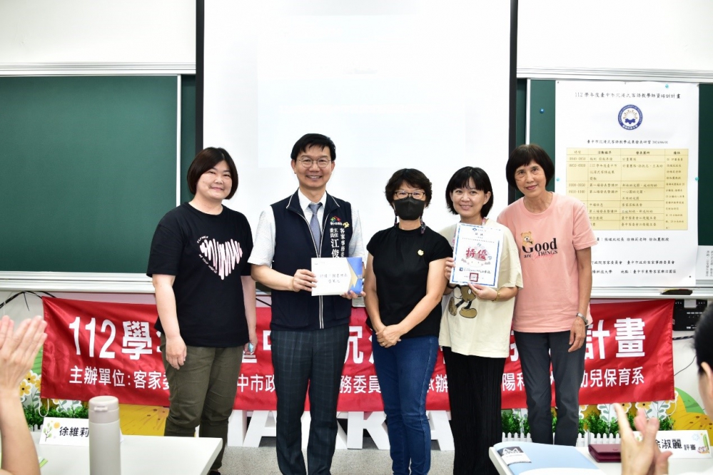 客語沉浸式教學成果發表觀摩會活動,市府客委會主委江俊龍、靜宜大學教授徐淑麗、中坑國小校長張暒玟、中央大學博士生徐維莉、南華大學前助理教授華慧敏、朝陽科大幼保系孫扶志教授及其學生團隊一同參與。