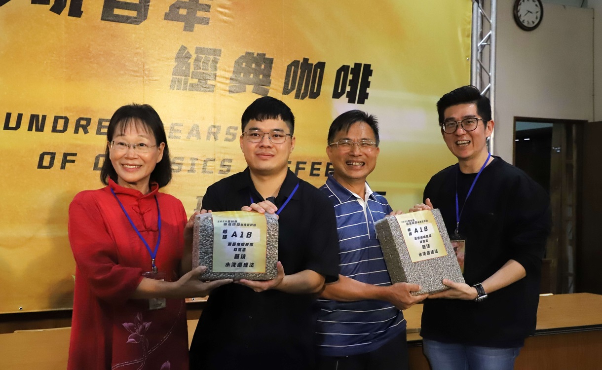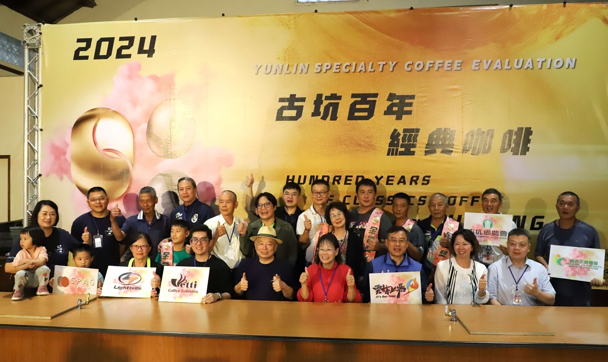 2024雲林縣國產精品咖啡豆評鑑成績今出爐,特等獎由嵩岳咖啡郭亮志(右4)以85.07分拿下。