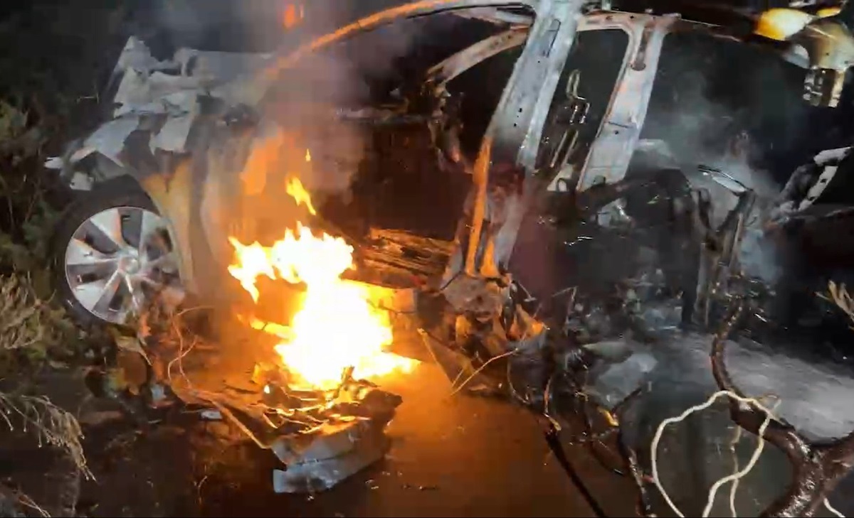 虎尾鎮下溪里三塊厝橋附近(國道1號高速公路橋下)發生一起特斯拉汽車墜落6公尺橋下斷2截,並起火燃燒。(圖/記者蘇峰毅翻攝)