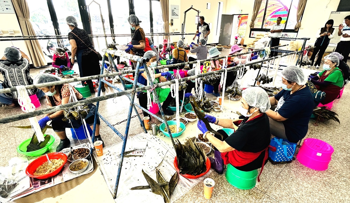 新移民姊妹協會理事長李欣璦等眾多社區代表,共同包製1萬顆幸福粽送給弱勢家庭。(圖/記者蘇峰毅攝)
