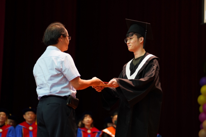 7日晚間所舉辦的進修部畢業典禮中,特別頒發勤學獎給曾獲得第51屆全國技能競賽全國賽青年組門窗木工職類金牌的創意產品設計系畢業生沈致維,表揚他對所熱愛的木匠工法的堅持及努力不懈對技法上精進的肯定;沈致維表示畢業後將持續以自己所擁有的木工技藝在室內裝修領域扎根學習,未來夢想開一間屬於自己的裝潢公司。