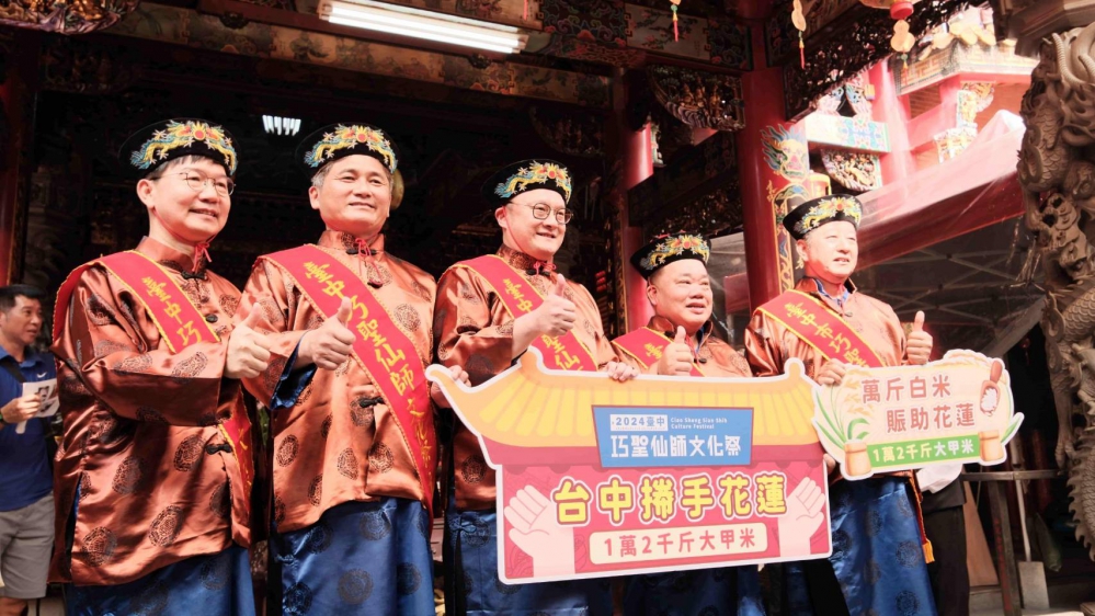 台中市客家事務委員會表示,「萬斤白米賑助花蓮」由巧聖仙師廟捐贈1萬2千斤特選大甲米予花蓮鄉親,由花蓮縣府客家事務處處長潘乾鑑,與吉安聖能宮主委同時也是花蓮縣客屬會理事長邱坤誠,一同代表受贈,表達台中「(ten shiu/客語:幫助)」花蓮,祈福地震災區早日重建完成!