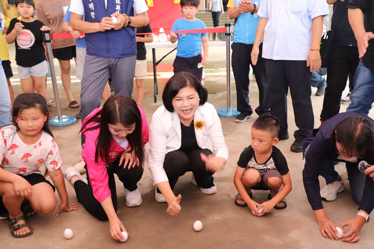 縣長張麗善和小朋友一起立蛋秒成功。(圖/記者蘇峰毅攝)