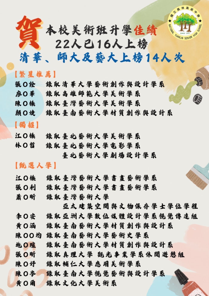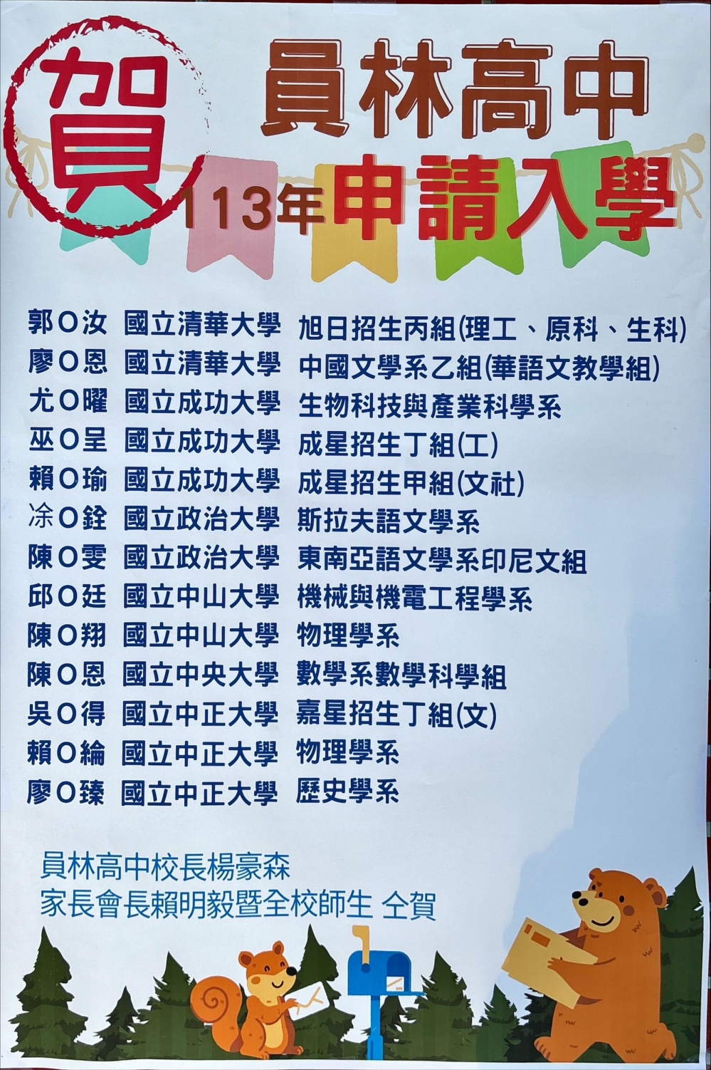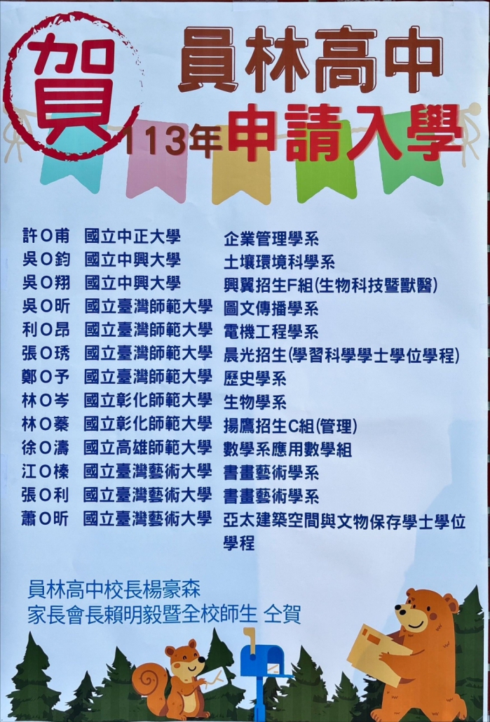 〔記者周為政員林報導〕113年度大學申請入學錄取名單公布,國立員林高中成績亮麗,280位同學上榜,其中不乏頂尖大學,校長楊豪森和會長賴明毅,發出海報,向金榜題名同學致賀,也感謝導師和任課老師的細心指導。