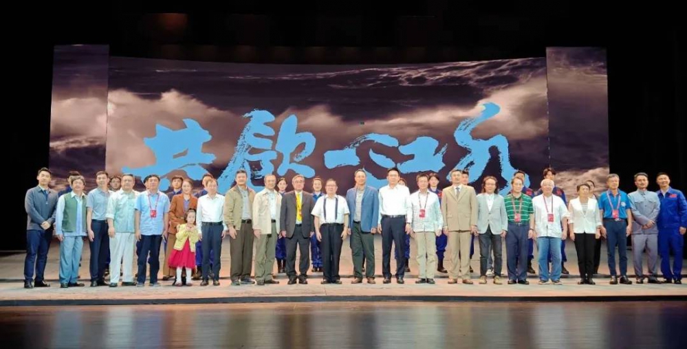 演出結束後,領導嘉賓上台與演員合影。吳成典、李炷烽、曹原彰三位曾經擔任台灣地區民意代表,並在任上積極推動大陸向金門、馬祖地區供水的金馬同胞與演職人員們親切交流,回憶當年在推動供水過程中的點滴往事。