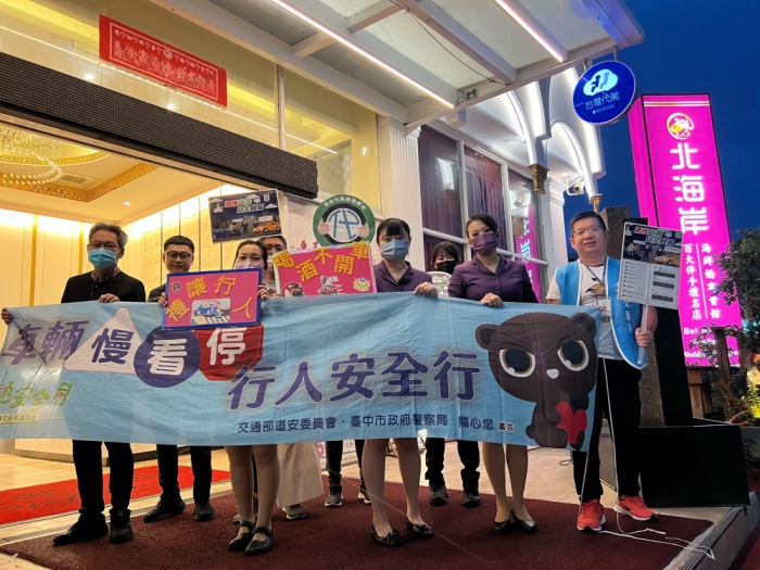 交通局為強化「以人為本」、「道路交通事故零死亡願景」,邀集轄區警察局及北屯區北海岸海鮮婚宴會館、大和屋日本國際美食館等店家參與綜合性道路交通安全宣導,前進飲宴場所提醒市民朋友,飲酒前務必先協調好指定駕駛,或飲酒後利用計程車、酒後代駕方式返家。