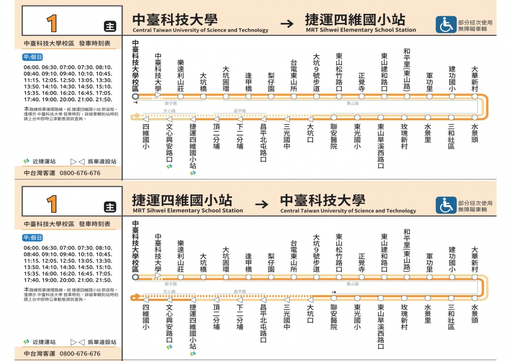 葉昭甫說,除提升75路公車路線效益,1路公車精實後,調整為「中台科技大學校區-捷運四維國小站」,同時增加班次至30車次,並延後至晚上9時50分收班,強化服務中台科技大學至捷運四維國小站區間,便利東山路沿線轉乘捷運綠線,民眾仍可在「大坑口」站周邊轉乘北屯幹線900路、8、15、21、203、270、276、277及901等多條公車路線繼續前往台中周邊。