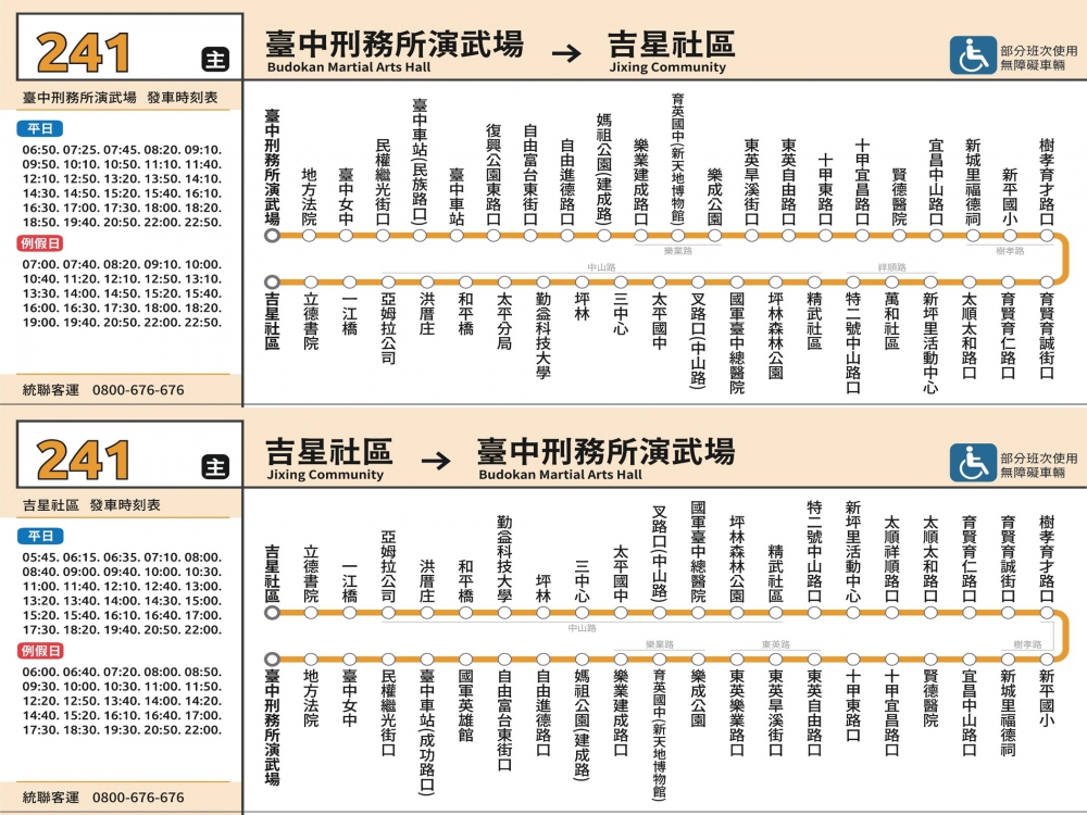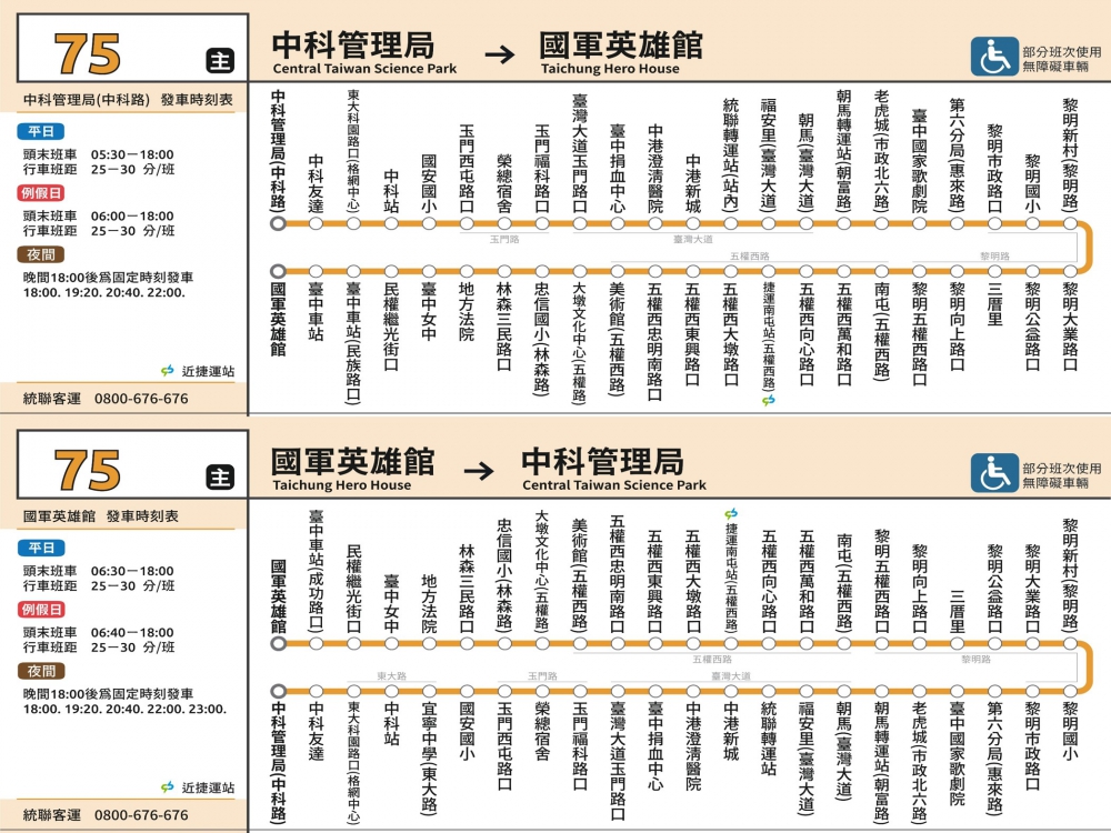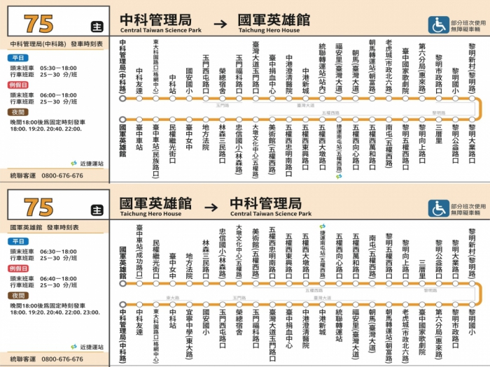 自7月1日起75路「台中榮總-吉星社區」裁切為西段75路「中科管理局-國軍英雄館」及東段241路「台中刑務所演武場-吉星社區」,並針對東、西段需求安排班次。